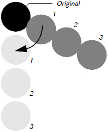 Duplicated objects are offset a preset amount (gray circles). By moving the first copy and repeating Duplicate, you can set a custom offset distance and direction (light gray circles). |